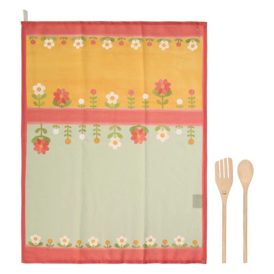 Set of 1 Florianne cotton tea towel and 2 wooden spoons